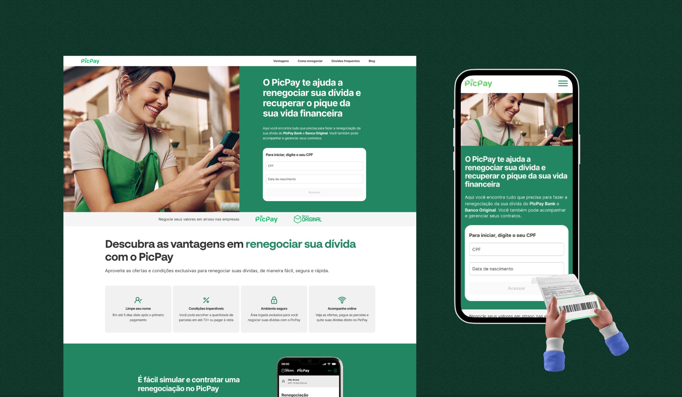 Redesenhei a homepage de renegociação para alinhar à identidade visual do PicPay, aumentar a confiança do usuário e apresentar benefícios de forma clara e persuasiva.